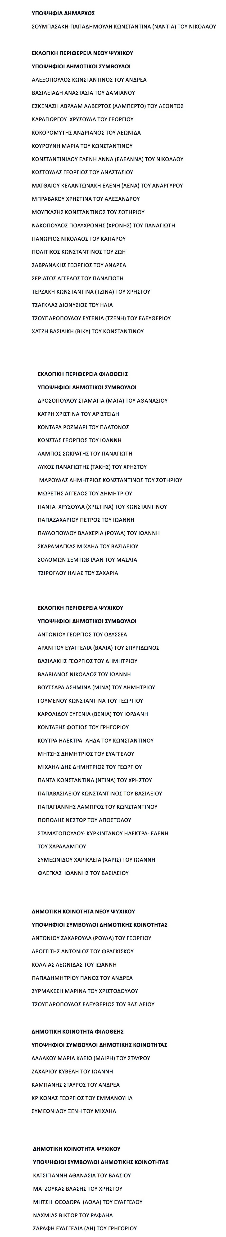 Είναι πλήρες με 69 Υποψήφιες-ους και από τα τρία προάστια. Με ισχυρότατη παρουσία γυναικών, 45%. Περιλαμβάνει άξιους συνδημότες, από ένα ευρύτατο φάσμα, κοινωνικό, επαγγελματικό και πολιτικό, που προέρχονται από την κοινωνία των πολιτών και όχι το “δημοτικό κατεστημένο”.