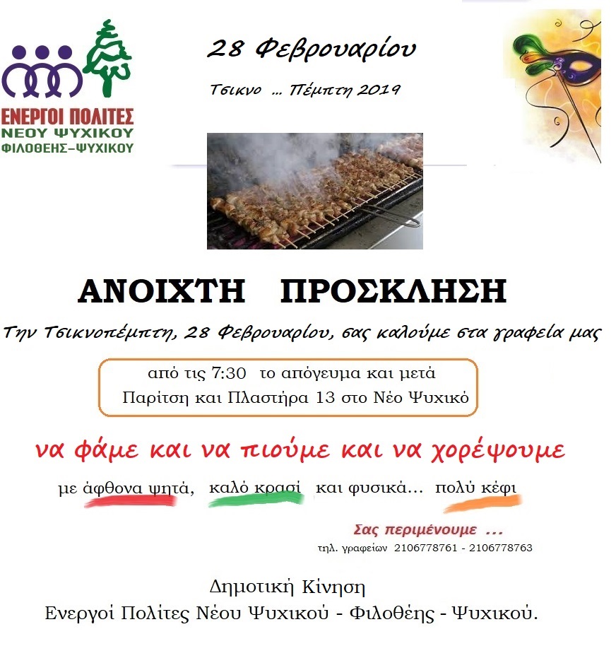 Kατηγορίες Uncategorized Τσικνοπέμπτη 2019 Post author Από Ενεργοί Πολίτες Νέου Ψυχικού Φιλοθέης Ψυχικού Post date 25 Φεβ. 2019 Δεν υπάρχουν σχόλια στο Τσικνοπέμπτη 2019 Κοινοποιήστε: Μοιραστείτε στο X(Ανοίγει σε νέο παράθυρο) Χ Mοιραστείτε στο Facebook(Ανοίγει σε νέο παράθυρο) Facebook Μου αρέσει! Φόρτωση... ← ΑΝΑΚΟΙΝΩΣΗ ΤΩΝ ΕΝΕΡΓΩΝ ΠΟΛΙΤΩΝ ΝΕΟΥ ΨΥΧΙΚΟΥ – ΦΙΛΟΘΕΗΣ – ΨΥΧΙΚΟΥ → Τσικνοπέμπτη στα γραφεία της Δημοτικής Κίνησης των Ενεργών Πολιτών Νέου Ψυχικού Φιλοθέης Ψυχικού. Σχολιάστε Ακύρωση απάντησης Δ Ο ιστότοπος χρησιμοποιεί το Akismet για την εξάλειψη των ανεπιθύμητων σχολίων. Μάθετε πως επεξεργάζονται τα δεδομένα των σχολίων σας.