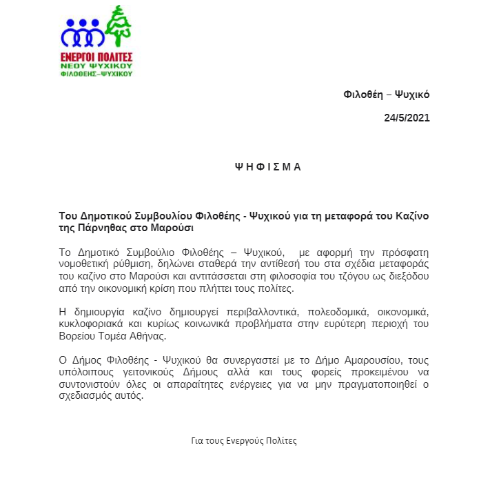 Kατηγορίες Uncategorized Ψήφισμα Ενεργών Πολιτών για το Καζίνο στο Μαρούσι Post author Από Ενεργοί Πολίτες Νέου Ψυχικού Φιλοθέης Ψυχικού Post date 25 Μάι. 2021 Δεν υπάρχουν σχόλια στο Ψήφισμα Ενεργών Πολιτών για το Καζίνο στο Μαρούσι Εγκρίθηκε από το Δημοτικό Συμβούλιο του Δήμου μας, το ΨΗΦΙΣΜΑ των Ενεργών Πολιτών Νέου Ψυχικού – Φιλοθέης – Ψυχικού κατά της εγκατάστασης Καζίνο στο Δήμου Αμαρουσίου. Κοινοποιήστε: Μοιραστείτε στο X(Ανοίγει σε νέο παράθυρο) Χ Mοιραστείτε στο Facebook(Ανοίγει σε νέο παράθυρο) Facebook Μου αρέσει! Φόρτωση... ← ΠΡΟΒΟΛΗ ΤΑΙΝΙΑΣ στην αυλή των γραφείων μας → Παράδοση κλινοσκεπασμάτων και ρούχων στην Μάνδρα Σχολιάστε Ακύρωση απάντησης Δ Ο ιστότοπος χρησιμοποιεί το Akismet για την εξάλειψη των ανεπιθύμητων σχολίων. Μάθετε πως επεξεργάζονται τα δεδομένα των σχολίων σας.