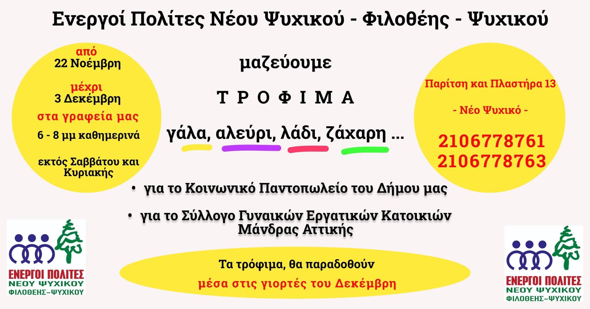 Συντρόφισσες και σύντροφοι,διαβάστε την αφίσσα! Μαζεύουμε τρόφιμα τα οποία θα παραδώσουμε στο κοινωνικό παντοπωλείο του Δήμου μας και στον Σύλλογο Εργατικών Κατοικιών Μάνδρας Αττικής γιατί υπάρχει μεγάλο πρόβλημα στην περιοχή και μας ζήτησαν να τους βοηθήσουμε αποκλειστικά και μόνο με τρόφιμα.Φέρτε ότι μπορείτε, κυρίως χρειαζόμαστε γάλατα, αλεύρι, ζάχαρη, λάδι και φυσικά ότι άλλο νομίζετε λόγω των γιορτών των Χριστουγέννων.