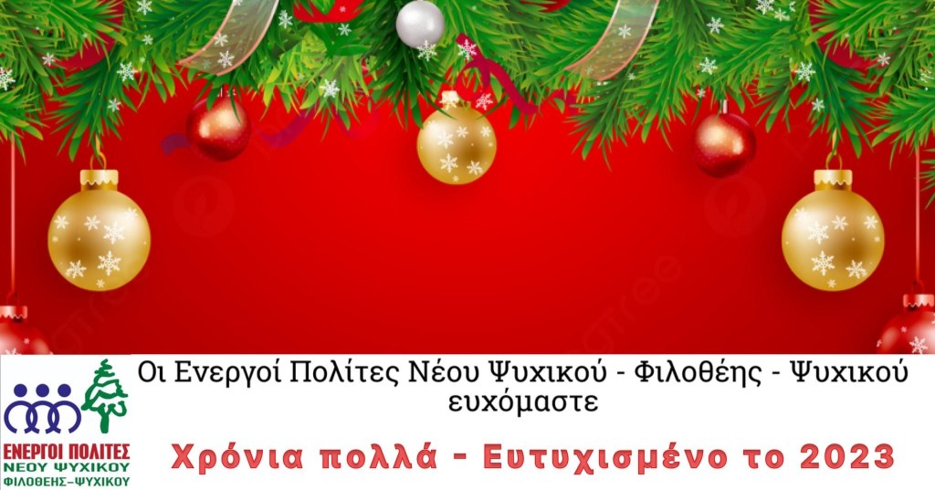Kατηγορίες Uncategorized Χρόνια πολλά. Ευτυχισμένο το 2023 Post author Από Ενεργοί Πολίτες Νέου Ψυχικού Φιλοθέης Ψυχικού Post date 23 Δεκ. 2022 Δεν υπάρχουν σχόλια στο Χρόνια πολλά. Ευτυχισμένο το 2023 Κοινοποιήστε: Μοιραστείτε στο X(Ανοίγει σε νέο παράθυρο) Χ Mοιραστείτε στο Facebook(Ανοίγει σε νέο παράθυρο) Facebook Μου αρέσει! Φόρτωση... ← ΑΛΛΗΛΕΓΓΥΗ ΣΤΗΝ ΔΟΜΗ ΦΙΛΟΞΕΝΙΑΣ ΤΩΝ ΚΟΥΡΔΩΝ ΤΟΥ ΛΑΥΡΙΟΥ. → Δελτίο Τύπου: Οι Ενεργοί Πολίτες δηλώνουν παρών στις αυτοδιοικητικές εκλογές Σχολιάστε Ακύρωση απάντησης Δ Ο ιστότοπος χρησιμοποιεί το Akismet για την εξάλειψη των ανεπιθύμητων σχολίων. Μάθετε πως επεξεργάζονται τα δεδομένα των σχολίων σας.